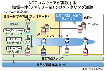 NTTコムウェア(杉本迪雄社長)は、2009年、新入社員教育の一環として実施しているメンタリング制度を刷新。配属先の部署全体で新人を育てる「ファミリー制」を実施するほか、メンターの普段の活動における情報共有などを行うための横のつながり「メンターグループ」の設定により、新人社員の業務面・心理面でのバックアップ体制をより高めていく取り組みを行っている。