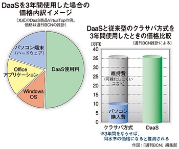 丸紅は、自らが提供するDaaS型サービス「Virtua Top」の利用料金を今年7月、大幅に低減。最廉価版で月額3980円(1年契約ベース、税別)と、旧価格比で約4割値下げした。しかし、DaaSコスト全体の約30%は別途購入するWindows OSや、ビジネス用途で必須なOfficeなどのライセンス費用、約20%はパソコン端末(ハードウェア)が占める。週刊BCNによるDaaSベンダーなどへのヒアリングによれば、仮想化サービス向けのWindows OSの価格は3年間で約5万円。1か月あたり1400円ほどになる。