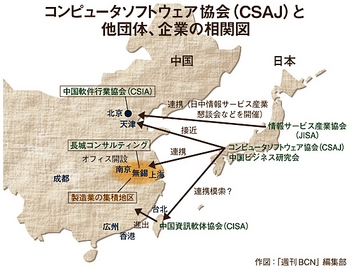 同じくCSAJ会員の長城コンサルティングが、中国最大級の製造業集積地帯にある江蘇省江陰市にオフィスを昨年設置。CSAJでは、09年9月に江陰市の視察ツアーを実施し、竹原主査をはじめ、日立情報システムズ、情報技術開発などのキーパーソンら10人余りが参加している。製造業向けのパッケージソフトをもつベンダーにとって、江陰市などが位置する工業ベルト地帯は巨大なマーケットそのもの。「メンバー同士が知恵を出し合いながら販路開拓に向けた研究を進める」(竹原主査)と、中国進出に意欲を示す。日中の業界団体やCSAJの会員同士の連携を、いかに密接に進めるかが中国ビジネス拡大のカギを握りそうだ。(安藤章司)