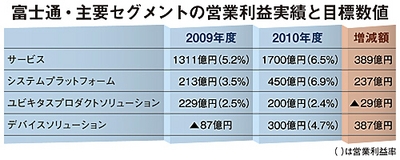 表には、事業セグメント別でみた営業利益の昨年度実績および今年度計画を示した。4セグメントのうち、PCや携帯電話開発・販売などの「ユビキタスプロダクトソリューション」は唯一の減益計画で、半導体などの「デバイスソリューション」は赤字からのV字回復を目指す。そして、最も売り上げ金額を増加させるのが「サービス」で、最も営業利益率の伸び率が高いのが「システムプラットフォーム」になる。主要セグメントのなかでも、この「サービス」と「システムプラットフォーム」が、2倍の利益計画のカギを握りそうだ。