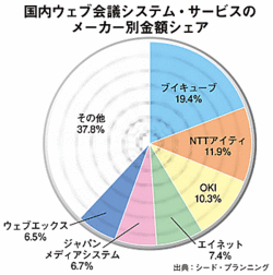 ブイキューブは1998年設立のITベンチャーで、オンラインのコミュニケーションシステム・サービスに強い。主力のウェブ会議システムでは、約10年で国内市場トップシェアの地位を築いた。調査会社シード・プランニングの調べによれば、ブイキューブの国内ウェブ会議市場の金額シェアは19.4%で、2位のNTTアイティに10%弱の差をつけている。