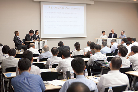 中小企業情報化支援協議会は、中小のユーザー企業と、組織化する会員とのビジネスマッチングの場を提供する任意団体で、初年度の年会費無料で会員を募っている。森戸氏の話によれば、一般社団法人化も検討しているという。 最後のセッションでは、中小企業の有識者を集めたパネルディスカッションを開催。前出の鬼澤氏と森戸氏に加えて、ユーザー代表として千代田漬物の柿澤好徹氏と、企業内ITCとしても活躍するネクストウェアの太田垣博嗣氏、ベンダー代表として富士通の弓田光正氏が登場し、ITの利活用について活発な議論が繰り広げられた。