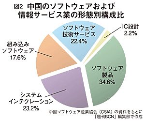 内訳は、ソフトウェア技術サービスが前年比31.4%の大幅増。ほかソフトウェア製品は26.3%増、SIは23.7%増、組み込みソフトは22.1%増だった(構成比は図2を参照)。日本では、落ち込みが極めて大きい製造業向けの組み込みソフトでさえ、中国では前年比20%余りの増加を示す。その前の年に比べて伸びが鈍ったとはいうものの、“世界の工場”と称される中国製造業の勢いを感じさせる。
