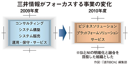 SIerの三井情報開発とNIerのネクストコムが合併して誕生した三井情報。2007年4月の統合から今年度(11年3月期)で4年目に突入している。合併前、「SIとNIの融合を実現する」インテグレータとして業界では話題を呼んだが、昨年度で3年という一つの節目を迎えた。現段階で果たして統合効果が出ているのか、気になるところだ。