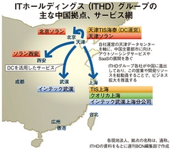 大手SIerのITホールディングス(ITHD、岡本晋社長)は、中国でのITアウトソーシングサービスの拡大を急ぐ。ITHDグループは、中国の主要都市に事業会社を置いており、拠点同士のサービス商材の連携を強化することでビジネスを伸ばす。とりわけ、アウトソーシングやクラウド/SaaS案件は、天津に今年新設した自社運営のデータセンター(DC)に集約。現地事業会社でITシステムの設計・開発を手がけ、その後は天津DCで運用するビジネスモデルを発展させる考えだ。