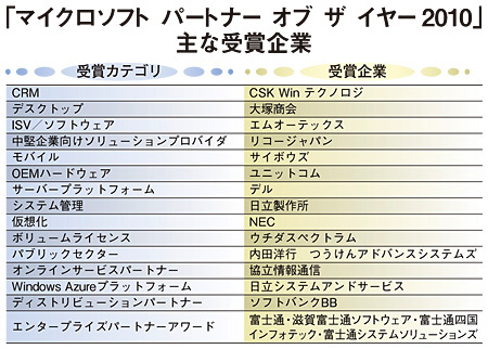 「マイクロソフトパートナーコンファレンス 2010」は、開発や販売などでマイクロソフト製品を取り扱うパートナーを集めた毎年恒例のイベント。マイクロソフトがパートナーに向けた施策を発表するほか、高い実績をあげたパートナーや先進事例をかたちづくった企業を表彰する内容も盛り込まれている(受賞企業は右表参照)。協業先に向けたメッセージを発信することを意図した、マイクロソフトの最重要イベントに位置づけられる。
