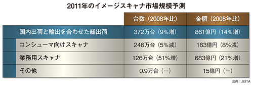 文書管理ソリューションのニーズの高まりに歩調を合わせるように、その関連機器であるスキャナが法人に導入され始め、今後も成長する可能性が出てきた。電子情報技術産業協会(JEITA)の調べによると、2011年のイメージスキャナ出荷予測(輸出も含む)は、08年に比べて台数は9%増の372万台、金額は14%増の861億円とプラス成長が予測されている。この内訳をコンシューマ向けと業務(法人)向けで分けると、コンシューマ向けは台数が5%減の246万台で、金額が8%減の163億円。一方、法人向けは台数が51%増の126万台、金額が21%増の683億円。市場をけん引するのは法人向けということが明らかになっている。