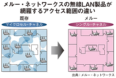 メルーは、「シングル・チャネル」と呼ばれる他社と異なるアクセス技術をもっている。この技術は、1台のアクセスポイントで“電球の光”のようにアクセス範囲を網羅するというもの。ノートPCなど、クライアント端末ごとに均等な接続を保証する。これまでは、「マイクロセル・チャネル」と呼ばれる多くのアクセスポイントを設置することでアクセス範囲をカバーする方式がメインだったが、オフィス内でつながらない場所があったり、同一チャネルによる干渉などという問題が発生していた。その点、同社の製品は特定チャネルの電波を細かく制御することが可能という利点がある。