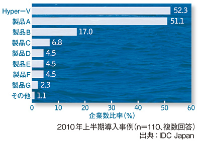 この有望分野でトップをひた走るのがヴイエムウェアだが、その構図に変化がみえ始めた。2010年1~6月の半年間に限定すると、x86サーバー用の仮想化ソフトウェアでいちばん多く導入されたのはマイクロソフトの「Hyper-V」だった(IDC Japan調べ、図参照)。「Hyper-V」がトップを獲ったのは今回が初めてとなる。マイクロソフトはサーバーOS「Windows Server 2008」に「Hyper-V」を組み込む戦略で、08年6月から提供を始めていた。2年の時を経て、期間限定、製品別ではあるものの、トップを奪った格好だ。