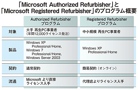マイクロソフトは、2009年4月、中古PC向けのライセンスプログラム「Microsoft Authorized Refurbisher」(MAR)を開始した。MARプログラムは、中古PCの販売取扱量が多い事業者がマイクロソフトと直接契約を結ぶ形となっている。翌10年には中小の事業者向けに「Microsoft Registered Refurbisher」(MRR)を開始。MRRは、中小の事業者がOEM製品販売代理店と契約を結ぶ必要がある。
