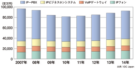 PBXからIP-PBXへと移り変わり、ニーズとして挙がってきたのが「VoIP(音声のIP化)」である。メーカー各社の「IP化で通話料を無料に」といったキャッチフレーズの下、多くの企業がIP-PBXとIP電話を導入した。IP-PBXとIP電話の特需は2005年頃まで続いたが、07年以降は減少傾向を辿っている。IDC Japanによれば、世界不況の影響を直接受けた09年(1~12月)の国内VoIP市場は、前年比10.7%減の840億3600万円と2ケタの減少。今年前半(1~6月)は、前年同期比3.4%減の466億4200万円という結果となっている。それでも、今年に入ってから大幅な市場縮小は回避されたとIDC Japanでは捉えており、景気回復に伴って11年以降はVoIP市場も回復。14年には923億3200万円になると予測している。ただ、気になるのはVoIP化の新規顧客が生まれてくるのかという点だ。VoIP市場は伸びるとはいえ、07年の市場規模までには達しない。しかも、IP-PBXに関してはほぼ横ばいで推移する格好だ。