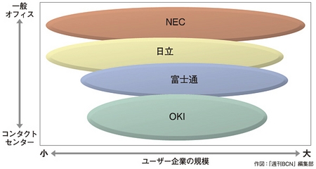 PBXの時代からビジネスを手がけるNEC、日立製作所、富士通、OKIネットワークスの国産メーカー4社をみると、IP-PBXのユーザー企業規模は、どのメーカーも大企業からSMB(中堅・中小企業)まで網羅している。ユーザー企業を最も多く獲得しているのはNEC。次いで日立、富士通、OKIネットワークスの順になっている。NECと案件で競合するケースが多いのが富士通。富士通は、競合のシェアを奪うため、パソコンやサーバーサイドからもユーザー企業に対して、「IPテレフォニー」を切り口にユーザー企業の乗り換えを促している。日立は、他社に比べてSMB(中堅・中小企業)の開拓に力を入れ、グループ会社を通じて事業を拡大しようとしている。ユーザー層は、NECと日立、富士通が一般オフィスが多い一方、OKIネットワークスがコンタクトセンター向け製品・サービスを武器に他社との差異化を図っている。ただ、コンタクトセンター分野は、外資系ベンダーのアバイアが積極的で、競争激化の様相を呈している。