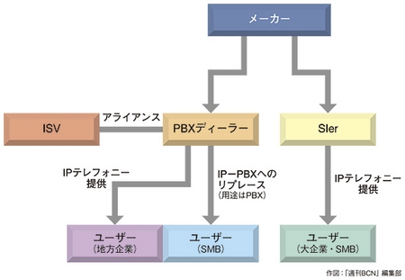 IP-PBXの販売面をみると、メーカー各社が確保しているのはPBX販社がメインとなっている。獲得するユーザー企業の規模は、直販は大企業、PBX販社はSMBと分けられる。しかし、最近は少し変化が現れてきた。PBX販社のなかでインテグレーションを手がけることが可能なベンダーとのパートナーシップを深めて、ハードではなくアプリケーションを切り口とした売り方を進め、大型案件を獲得しようとしている。単にPBXのリプレースを訴えるだけでは、案件を獲得することが難しいとの判断が働いているのだ。また、サーバーやプリンタなどを販売するSIerを新規販社として確保するケースもある。これは、NECや富士通が実施しており、サーバー販社とPBX販社の調整を行っているわけだ。さらに、地方の案件を獲得するため、アプリケーションベンダーをパートナーとして募り、PBX販社とアライアンスを進める動きも出てきた。OKIは、ソフトフォンなどコンタクトセンター向けアプリケーションを創造するための「COM@Will」という開発パートナー制度を設けている。直販と間接販売の比率は、売上高ベースで富士通が直販70%と間接販売30%、NECが直販70~80%と間接販売20~30%、OKIが直販45%と間接販売55%、日立がどちらも50%という状況。どのメーカーも、間接販売に力を入れていることは共通している。