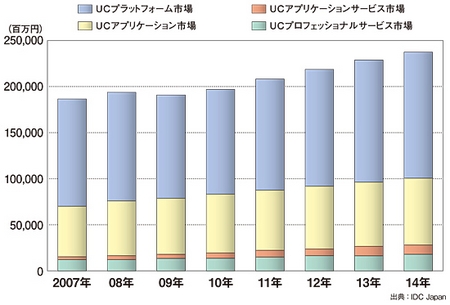 IP-PBX市場が成熟期を迎えているなか、メーカー各社は事業拡大に向けて次の一手を模索している。その一つが「UC(ユニファイドコミュニケーション)」だ。メーカー各社は、通話とIP化をベースに、UC関連で「IPテレフォニー」や「遠隔会議」など、コミュニケーションの観点から製品・サービスを提供しており、今まさに花開こうとしている段階にある。IDC Japanによれば、09年の国内UC市場規模は不況の影響で前年比1.5%減の1905億6400万円、そのうちIPテレフォニー分野が前年比10.7%減の大幅なマイナスとなったが、10年以降は回復。09年から14年までの年平均成長率を4.5%と予測している。14年には、2369億円の市場規模にまで達するという。とくに、企業向けVoIPサービス市場、IP会議システム/テレプレゼンス市場、IPコンタクトセンター市場が高い成長率を維持すると分析している。従来はユーザー企業に「電話」を導入させることが中心だったPBX関連ビジネスは、ハードのIP化で通話を中心としたコスト削減をアピールするようになり、ユーザー企業が「攻めの戦略」を行うためのコミュニケーションやワークスタイルの変革を実現するものにまで進歩した。そのため、メーカー各社のビジネス領域も、今後はさらに広がることが期待される。