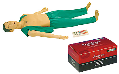 セーブマンアドバンス(高度救急処置シュミレーター)。生体に近い教育用モデルで医療現場の人材育成をサポートする(写真上)。赤いパッケージは「アテロコラーゲン」。高研が開発した抗原性の低いコラーゲンで、再生医療や核酸医療への応用が期待されている。