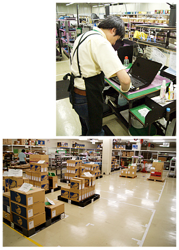 (下)納入したPCなどを垂直搬送機で2階に運ぶ