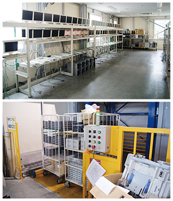 搬入されたPCは、当日中に搬送機で2階に上げられ、まずデータを消去する。クリーニング、デバイスチェック、OS搭載という一連の再生プロセスを経て、出荷という工程だ。一部は、データ消去後にOS未搭載のまま出荷することになる。データ消去には、ブランコ製のソフトウェアを採用。法人や教育機関から、データ消去だけの依頼が寄せられることもあるという。