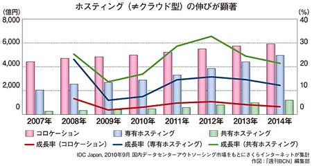 データセンター(DC)の市場規模は、堅調に伸びている。SIや受託ソフト開発が伸び悩むなかでも、DCを活用したアウトソーシングサービスの需要は依然として高水準にあることが背景にある。IDC Japanの調査をもとにホスティング事業者のさくらインターネットが集計したデータによれば、ユーザーがサーバーを共有して利用するホスティングサービスは2014年まで20%超の成長が見込める有望株。サーバーを専有して使うタイプでも10%超の伸びを維持する見込みだ。伸びが顕著なホスティング方式は、ベンダー側がハードウェアを買い揃え、ユーザーはサービスのみを月額で利用する。仮想化などの機能を加味すれば、クラウドサービスへの置き換えが可能なサービスだ。IDC Japanでは、国内DCアウトソーシングサービス全体の伸び率は、14年まで年間平均8.8%増で、同年には1兆2065億円の市場規模になると予測。IT機器の“所有から利用へ”の潮流が後押しするかたちで、DCへのアウトソーシングは成長している。