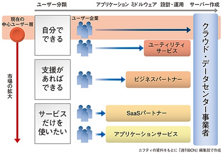 例えば、SIerのCSKが開発するパブリッククラウド向け制御ソフトは、Amazon EC2やニフティクラウドへの対応を表明している。こうしたユーティリティサービスを組み合わせることで、使い勝手が大幅に向上するわけだ。また、クラウド上に業務システムを構築するSIサービスや、アプリケーションソフトをクラウド経由で提供するSaaSやASPなどの付加サービスで、ユーザーの需要に応える方法もある。