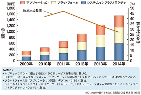 DCビジネス拡大の成長エンジンとなっているのが、クラウドサービスである。IDC Japanによれば、2010年の国内クラウドサービスの市場規模は前年比41.9%増の443億円に達する見込みで、14年までは年間平均成長率37.5%で伸びると予測している。実数では14年は09年の約4.9倍の1534億円になるなど、飽和感が漂う国内情報サービスのなかで数少ない成長分野だ。