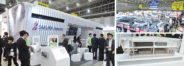 (左)ブースのデザインは石狩DCの外観を想定、(右上)クラウドEXPOの会場、(右下)石狩DCの断面模型を披露した