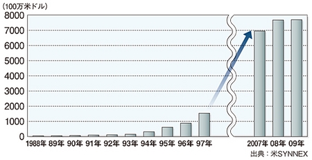 日本では知名度が乏しい米SYNNEXだが、2009年度(09年11月期)の売上高は、77億1900万ドルで、純利益は前年度比10%増の9210万ドルを計上。企業向けサーバーグループはユーザー数を前年比50%増やし、企業向けサーバーの売り上げは前年比11%増となった。事業として、ディストリビューションのほか、コントラクトアセンブリサービス、ビジネスプロセスアウトソーシング(BPO)を展開。拠点は、売り上げの95%以上を占める北米を筆頭に、中国や英国、メキシコ、フィリピンなどに設置している。