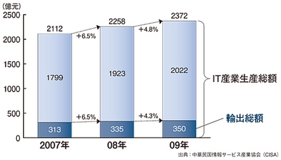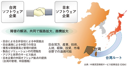 台湾と中国が2010年に、財貨貿易やサービス貿易、早期の市場開放などの諸分野で、積極的に交渉を進めることを目的とした「両岸経済協力枠組協定(ECFA)」を締結したのを機に、台湾のIT産業に注目が集まってきた。台湾のITベンダーの中国ビジネスに関するノウハウと日本のITベンダーの技術/管理力を組み合わせるかたちで中国市場へ進出する動きが広がってきている。