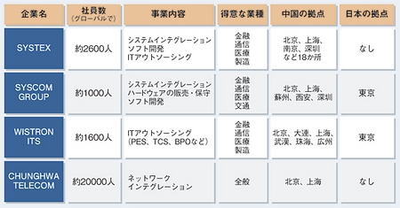 中国進出を図る日本のIT企業にとっては、中国でのビジネス展開に豊富な経験を積んできた台湾企業が最も有力なパートナーとなる。中国進出済みの台湾主要IT企業のトップを走るのが、金融や通信、医療、製造などの業種でのシステムインテグレーション(SI)を得意とするSYSTEX(精誠資訊)やSYSCOMグループ(凌群電腦)だ。なかでもSYSTEXは、グローバルで約2600人の従業員を有しながら、中国では北京や上海をはじめ、内陸部の地域もカバーする18か所に拠点をもつなど、最も規模が大きい。米調査会社IDCによる2010年の台湾ITサービスのベンダー別マーケットシェアでは、SYSTEXは3.4%を占め、外資系のIBM(10.9%)とヒューレット・パッカード(HP、6.3%)に次いで3位に入った。4位は大手通信事業のCHUNGHWA TELECOM(中華電信、2.8%)。そのほか、PES(プロダクト・エンジニアリング・サービス)などのITアウトソーシング分野で、中国に6拠点をもつWISTRON ITS(緯創軟體)が主要プレーヤーだ。