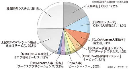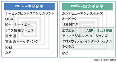 SMB市場のトップグループは他の基幹業務システム導入社数シェアでも常連の企業が多く、OBCはとくに年商100億円未満の企業に強い(ノークリサーチ調査)。比較的規模の大きい準大手・中堅企業向けでは、日立製作所やNECなどのERPメーカーのほか、人事・給与分野を得意とする専業メーカーなどが数多くひしめいている。従業員1000人以上をメインターゲットにする専用パッケージメーカーのカシオヒューマンシステムズ(CHS)やSaaS/BPO事業を展開するラクラスなどが顔をのぞかせる。このほか、人事・給与分野に強く、ASP/SaaS提供しているエフエムやアマノビジネスソリューションズなども控えており、メーカーや提供形態はバラエティに富む。「SaaS型アプリケーションベンダーのクロスヴィジョンインターナショナルは外資系企業の給与体系・商慣習に対応していて外資系企業に強い」(アイ・ティ・アールの藤巻信之シニア・アナリスト)など、特定の業界・業種・企業に特化して支持を得ているメーカーも存在する。