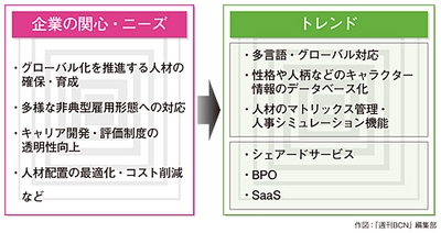 大手企業を中心に、間接業務を子会社化して共有サービスとして提供するシェアードサービスや、SaaS、BPOの流れが加速化していく可能性がある。中堅企業向けでは、FJMが財務管理システムに続いて人事管理システムのSaaS提供を開始する方針を明らかにするなど、SMBにとってはサービスの選択肢が増えてきている状況だ。興味深いのは2010年に日本市場に参入したSaaS型アプリケーションメーカーの米シルクロードテクノロジーの動きである。同社のサービスは多言語・グローバル対応しており、日本人社員だけでなく現地採用社員も含めて一元管理することで、企業のグローバル展開のニーズを取り込もうとしている。サービスは人材の能力開発などに力点を置き、給与計算などは他社とのアライアンスで補完する方針。能力開発という点では、国産メーカーの間でも性格や人柄などの定性情報をデータベース化するパッケージをCHSが販売するなど、人事・給与のコア部分以外で付加価値をつける動きがみられる。なお中小企業は、給与パッケ-ジやExcel管理で間に合わせているケースが少なくない。ピー・シー・エー(PCA)の担当者は「(人事管理システムは)過剰スペックで、機能の説明に寄りかかっているところがある。活用法を説明しきれていない」と話す。このあたりに、製品開発のヒントがありそうだ。