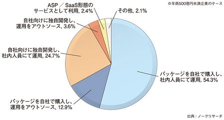ノークリサーチによると、SMBで最も多い利用形態は、パッケージを自社で購入して社内人員で運用する方法で、全体の54.3%を占める。パッケージを自社で購入して運用をアウトソーシングする企業は12.9%。独自開発は、社内での運用とアウトソーシングする場合を合わせて28.3%となっている。ASP/SaaS形態の利用はわずか2.4%にとどまるが、基幹業務領域のなかでは財務管理や生産管理などよりもシステムの独立性が高く、比較的SaaSとの親和性が高い。こうした見方があるなか、岩上シニアアナリストはSMBのSaaS普及には懐疑的な立場をとる。「情報の秘匿性の観点からASP/SaaSは普及するとは考えにくい」。加えて、自社内運用+システム面のルーチンワークを外部に委託のほうがコストメリットが高くなる、と説明。ただし、給与明細発行や出退勤管理などの特定業務のみを切り出した「追加ニーズをサービスで補う」かたちでのSaaS利用は少なくないという。一方で、比較的規模の大きい企業は、人事管理システムのSaaS化のコストメリットを享受しやすく、導入事例も多くみられるようだ。つまり、SaaSは企業規模に応じて「既存システムを補完する意味でのSaaS活用」と「人事業務全体のアウトソーシングに近い形態をとるもの」に、その利用形態が分化していくと分析している。