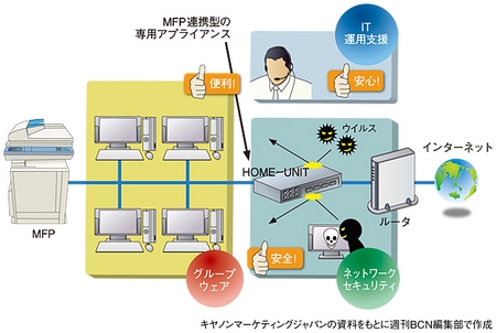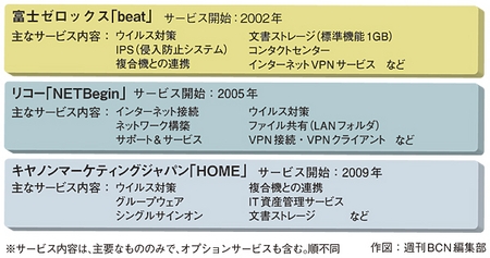 MFPのネットワーク接続機能を使ったサービスは、富士ゼロックスの「beat」やリコーの「NETBegin」、キヤノンマーケティングジャパン(キヤノンMJ)の「HOME」などが有名で、ともに中小企業をターゲットとしている点で共通している。最も早くサービスを始めた富士ゼロックスは、「中小企業の業務効率を高めるツール」(富士ゼロックス・岡崎宏晃・ビジネスソリューション・サービス営業部長)として2002年に「beat」を投入。ネットサービスを提供するための専用アプライアンスを客先に設置し、ウイルス対策やファイヤーウォール、自社製複合機との連携を行う仕組みだ。リコーは、インターネット接続やウイルス対策、ネットワーク構築サービスなどをセットにした「NETBegin」を2005年にスタート。キヤノンMJは独自に開発したウイルス対策などに加え、独自のグループウェアやIT資産管理、シングルサインオンなどの機能を包含した「HOME」を2009年から始めている。