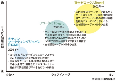 中小企業向けMFP連携ネットサービスの最大シェアを獲得しているのは、サービス開始時期が最も早かった富士ゼロックスの「beat」だ。ユーザー数は明らかにしていないが、本紙の推計では10万ユーザー数を射程内に入れているとみられる。韓国でも同様のサービスを展開するなど、国内外でのシェア拡大に余念がない。後を追うのがリコーの「NETBegin」で、「リコーのMFPや複写機を使う中小事業所のうち、NETBegin導入率は15%余りに達している」(リコーテクノシステムズの服部伸吾・ビジネス推進センター副センター長)と、堅調にシェアを拡大。2009年、MFPの機器販売は大幅に落ち込んだが、ネットサービスは主要3社ともに堅調に推移するなど、景気に左右されにくいストック型ビジネスの強みをみせた。