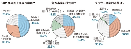 海外事業の展開とともに、各社が本腰を入れて取り組んでいるクラウドについては、IT業界は熱狂的にPRしていたが、それとは裏腹に、経営者は慎重にみている。クラウドを強化事業に挙げることが多いものの、2010年の実績として「計画よりも弱い(遅れている)」「やや弱い」と回答した企業が全体の40%に到達している。過度な期待をもっていたIT企業が多かったのかどうかは定かではないが、少なくとも「計画通り」という回答よりも、若干ながら慎重な姿勢を示す回答が多かった。表向きではクラウド、クラウドというものの、実際のビジネスは思うように伸びていないのが実情のようだ。