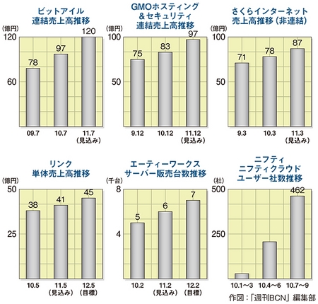 強気の投資の背景には、クラウド型サービスへの需要拡大や、DC活用型アウトソーシング市場の拡大がある。調査会社のIDC Japanは、国内DCアウトソーシング市場は2014年までの年平均成長率を8.8%、市場規模は1兆2065億円に拡大すると予測。これを裏づけるように、有力ベンダーの売り上げなどの経営指標は、軒並み2ケタ増の勢いを示している(図参照)。情報サービス市場が回復基調にあるとはいえ、クラウド/ホスティング関連事業の伸びは突出して高い。