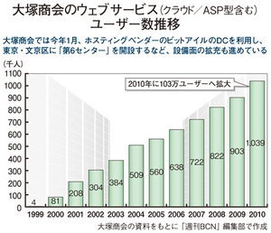 大手SIerの大塚商会は、クラウドやASPなどを含むウェブサービスの利用者が2010年末に103万ユーザーに到達した。100万ユーザー超えは同社初の快挙だ。グループウェアやワークフローなどの「アルファオフィス」や、メールサービスの「アルファメール」、給与明細のウェブ閲覧でペーパーレス化する「たよれーる給与業務支援サービス」といったリーズナブルで使い勝手のいいアプリが会員獲得に貢献。大塚裕司社長は、「昨今、クラウドサービスが注目されているが、当社ではむしろクラウドを前面に出さずとも100万を超えるユーザーを獲得することができた」と、顧客はクラウドを求めているのではなく、コンテンツやアプリで評価していると分析する。