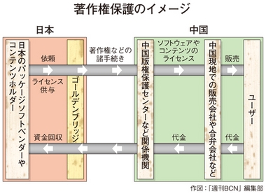 中国版権保護センターなど関係機関では、パッケージソフトのライセンス料金の日本への送金支援サービスも行っている。同センターがライセンスを預かり、これを中国現地での販売会社に届け、代金を日本の版元に送る仕組みだ。一定の手数料は発生するものの外貨送金が効率的にできるメリットがある。ゴールデンブリッジを通じて、こうしたサービスを利用する日本企業は、まだ数十社にとどまる。だが、サービスの認知度の高まりによって、2011年は100社を超えると見込まれている。森田社長は「中国における日本のパッケージソフトやコンテンツ流通の活発化につながる」と、手応えを感じている。(安藤章司)