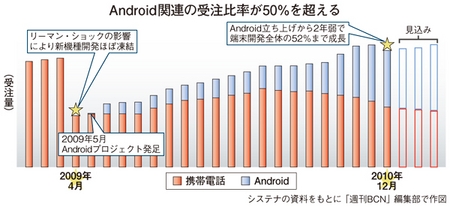 これまでクローズドな独自OSを駆使してきた技術者にとって、オープンなAndroid OSには不慣れな面が多い。オープン環境へ移行するにはスキル転換が不可欠。携帯電話メーカーの技術者事情も同様で、自前で技術者を養成する時間を節約するため、組み込みソフト開発を得意とするSIerに発注を増やしている。ただでさえ、日系メーカーはスマートフォンに出遅れており“時間をカネで買う”ことで、アップルをはじめとする先行ベンダーに追いつこうと必死だ。