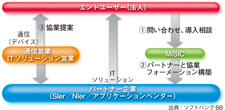 ソフトバンクBBが設立したMISICは、モバイルインターネットデバイスや関連するソリューションの開発・導入を支援する体制を整備したもの。狙いとするのは、(1)ソフトバンクBBの直販営業部隊の案件の協業提案、(2)パートナー企業のエンドユーザーへの協業提案、(3)MISICに問い合わせのあるエンドユーザーのパートナー企業への紹介──の3項目である。