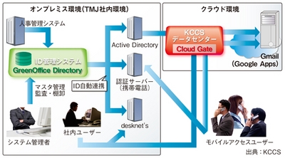 TMJではすべてをSaaSで実現したかったが、セキュリティ上の懸念があったことから、オンプレミスでグループウェアを導入。SaaSとオンプレミスを連携して利用する必要性が出てきたため、社内システムとSaaSの間でアカウントを同期することが重要な要件となった。他のベンダーがスクラッチ対応を提案するなか、KCCSでは自社のID管理製品「GreenOffice Directory」を提案。パッケージの安定性やメンテナンス性も含めて評価が高かったことが決め手となった。「GreenOffice Directory」をハブにすることで、社内の人事管理システムとグループウェア、ディレクトリ・サービスの「Active Directory(AD)」、携帯向け認証サーバーにおけるIDの自動連携を実現。さらに「ADとGmailの連携を実現するために、インターナショナルシステムリサーチのGoogle Apps対応シングルサインオンサービス『Cloud Gate』を利用した」(KCCSのICT営業本部ソリューション営業2部アウトソーシングサービス営業課・市川稔課長)ことでオンプレミスとクラウドにまたがるID統合管理を実現した。