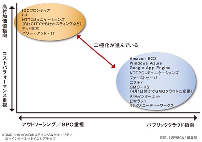 主要ベンダーは、相次いでクラウド型の新しいサービスを打ち出している。クラウド型の新サービスの指向性をみると、「高付加価値型でアウトソーシング/BPO重視」のパターンと、「コストパフォーマンス重視型でパブリッククラウド指向」の二つに大きく分かれる。前者は、企業の基幹業務システムをはじめとするミッションクリティカル系に適しており、後者はネットサービスや通販サイトなど需要の波が大きいシステムに適している。