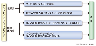 クラウド/ホスティングベンダーの販路は、直販系と間接販売系の主に2系統。パブリッククラウドの先駆的存在のAmazon EC2のように、オンライン決済で誰でも自由に使えるウェブ直販型や、自社の営業人員によるオフラインの販売促進を行う一方で、SIerのソフト開発ベンダーを経由する間接販売が有力視されている。多くのソフト開発ベンダーはDCなどの物理的なインフラを所有しておらず、自らのパッケージソフトをSaaS方式などで提供する場合、クラウド/ホスティングベンダーと組んだほうがコストやリスクを軽減できるメリットがある。