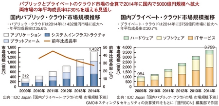 クラウド/ホスティングサービス市場は、全体でみれば力強く成長する見込みだ。GMOホスティング&セキュリティ(2011年4月1日付でGMOクラウドへ社名変更の予定)は、IDC Japanの調査をもとに国内クラウドサービス市場は年率30%余りで拡大するとみており、とりわけクラウドサービスの伸びは大きいと予測する。ITリソースを複数のユーザーで共有するパブリッククラウド型は、国内で2014年に1432億円、クラウド環境を個別に専有するプライベートクラウド型は3759億円で、両タイプを合計すると5000億円を超える。仮にクラウド領域で10%のシェアを占めると、単純計算で年商およそ500億円となる。このため有力ITベンダーは相次いでクラウド領域の強化を表明している。一方で、従来型のホスティングサービスは、一部のベンダーで「契約数は伸びているが、単価下落で金額ベースでは伸び悩む傾向がみられる」(有力ホスティングベンダー幹部)と、クラウドとは対照的な動きをみせている。