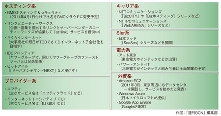 クラウド/ホスティングベンダーを属性別にみると、大きく六つに分けられる。最大勢力はインターネットの拡大とともに伸びてきたホスティング系のベンダー。主にネットサービスや通販サイトなどの優良顧客を多数もつ。次に、インターネットプロバイダや通信キャリア系といったネットワークに強い事業者が名を連ねる。クラウドの構造上、データセンター(DC)に通信トラフィックが集約される傾向が強く、このネットワーク周りの善し悪しがサービス品質を大きく左右するためだ。今回の主要6グループには、NTTデータや野村総合研究所(NRI)など大手SIerが手がけるITアウトソーシングやBPO(ビジネスプロセスアウトソーシング)を主力とするSI型クラウドサービスは除外した。ただし、例外はある。SIerの日本ラッドは超低消費電力のDCを独自に構築し、徹底的なコストパフォーマンスを指向したクラウドサービスを展開。コストパフォーマンスで勝る外資系への対抗心をむき出しにする。