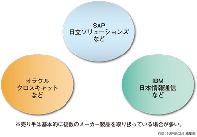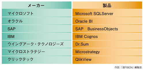 BIの市場では、大手コンピュータメーカーなどによる専業ベンダーの買収が相次いだ。現在、BI関連の製品を提供しているのは、マイクロソフト、オラクル、IBM、SAPなど、外資系の雄。また、独立専業ベンダー大手であるマイクロストラテジー、新興のクリックテックなど、たくさんの選択肢がある。BIツールは、国内ではウイングアークテクノロジーズの「Dr.Sum」が、ライセンス販売数でトップ。金額シェアではSAPのBusiness Objectsが1位だ。