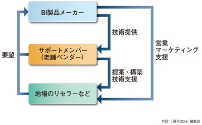 老舗ベンダーがBI製品のメーカーとリセラーの間に入って、彼らがメーカーとリセラーの橋渡し役となる。長年培った提案・構築のノウハウや技術支援をリセラーに提供して、一方では現場から上がってきた要望をメーカーにフィードバックしていく。BI製品のメーカーは4社の老舗ベンダーで構成する「サポートメンバー」に技術支援を行い、リセラーには営業支援とマーケティング支援を提供するというトライアングルの協業体制だ。中堅・中小企業には、まだまだ本格的にBIが入っていない。BIのすそ野を広げるための、業界横断的な取り組みを展開しており、その活動ぶりに注目が集まっている。