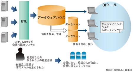企業内のシステムから必要なデータを抽出し、意思決定を支援するビジネスインテリジェンス(BI)は、専門スキルが要求され、しかも高額で、これまでごく限られた企業や部門にしか導入が進まなかった。しかし今、全社的に情報を統合し、現場の全社員が簡単に分析、活用できるBIが開発され、需要が高まっている。導入のすそ野も徐々に大企業から中堅・中小へと広がりつつあり、モバイルデバイスへの対応が進む。(文/鍋島蓉子)