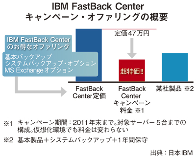 だが同社によれば、「競合他社製品に比べて競争優位のある製品だが、国内のバックアップソフト市場では、世界に比べてシェアを獲得できていない。仮想OSがいくら増えても価格が変わらないライセンス体系にもかかわらず、他社製品に比べて相対的に価格が高かったことなどが要因だ」(西倉マネージャー)とみる。そこで、国内で高いシェアを誇るシマンテックの製品群「Backup Exec」やCAの「ARCserve」などに対抗するため、定価の半額以下の価格を打ち出し、VAD経由で2次店へ同製品を波及させる「IBM FastBack Centerキャンペーン・オファリング」を開始したのだ。