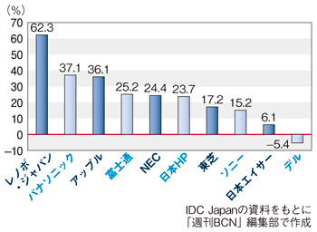 レノボ・ジャパンの2010年の国内パソコン市場シェアは6位だが、09年は8位で、順位を2ランク上げている。09年の出荷台数と比較した伸び率では、断トツのトップで、09年比成長率は62.3%。市場全体の伸び率17.9%を大きく上回っている。