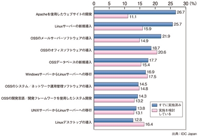 IDC Japanは、OSSの導入を検討している企業1015社に対して、検討対象としていたOSS関連のプロジェクトを実施した項目と、実施を検討しているプロジェクトについて調査した。Linux関連で、ユーザーが最も多く実施したプロジェクトは、Linuxサーバーの新規導入、その次がWindowsからLinuxへの移行、さらにはUNIXからLinuxへの移行である。Linuxは、互換性の高いUNIXからの移行するために利用されるのが一般的だが、その状況は変わり、ユーザー企業はWindowsからの移行にも高い関心をもっていることがわかる。また、データにはないが、国内Linux最大手のレッドハットの廣川裕司社長は、「Linuxを基幹系システムに活用する動きが非常に強まっている」と話している。